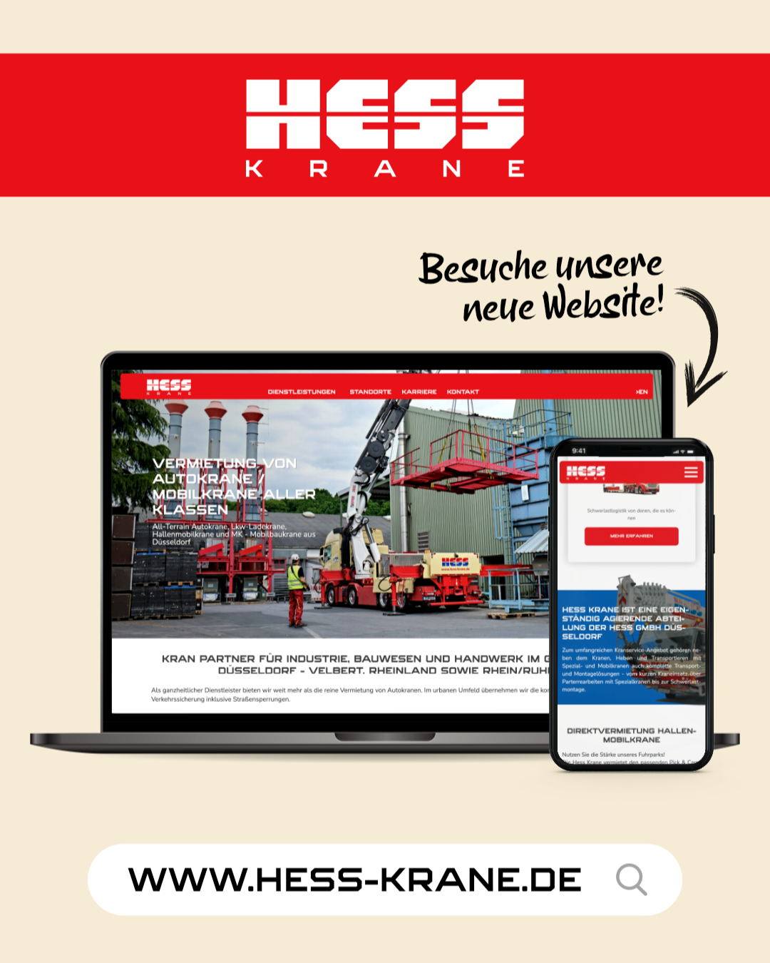 Wir heben nicht nur Lasten – sondern jetzt auch unseren Krane-Online-Auftritt! Unsere neue Homepage ist online! Mit noch mehr Infos, noch mehr Kran und einem direkten Draht zu unserem Team. Ob Bauprojekt, Industriemontage oder Maschinentransport, wir haben den passenden Kran für Dich. Jetzt reinschauen und Projekt starten: HESS Krane Düsseldorf [...]
